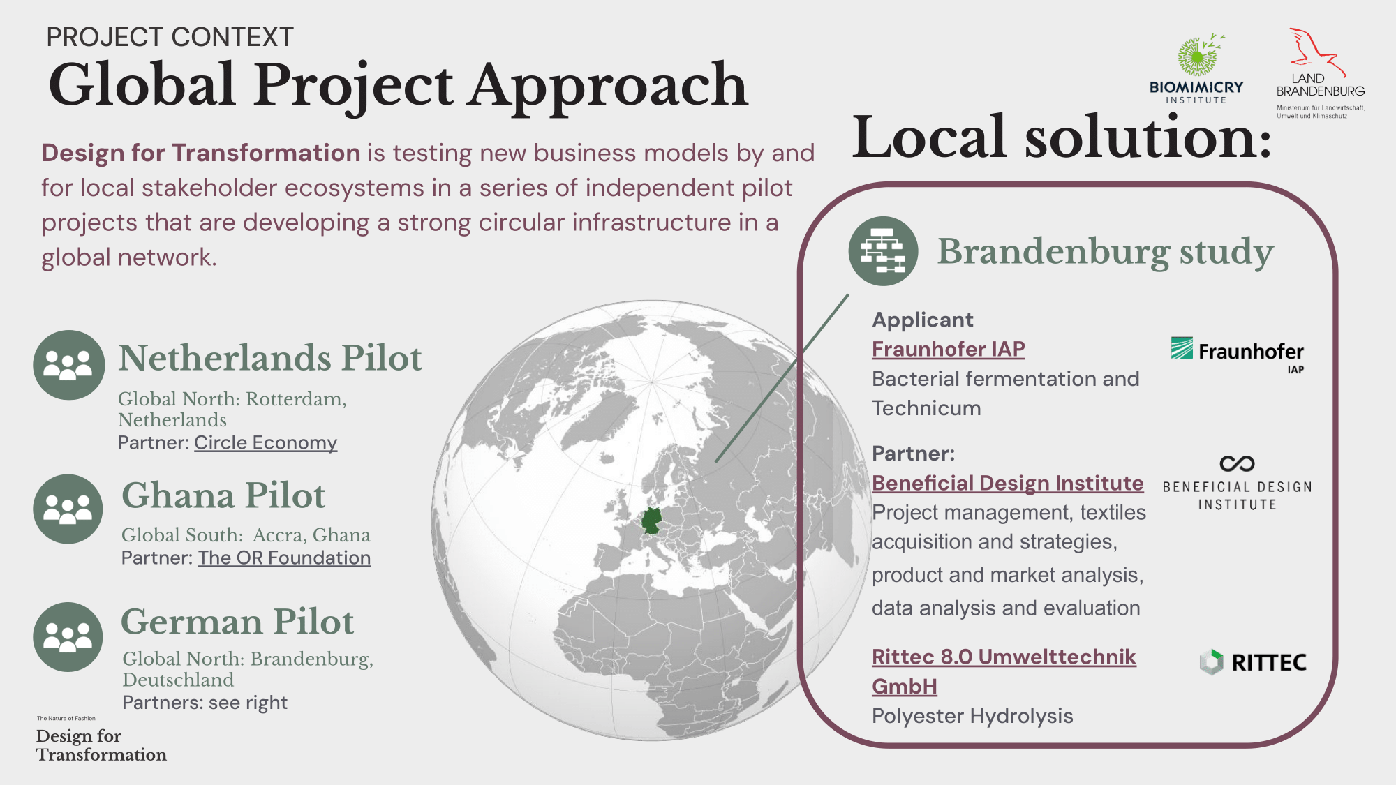 Design for Transformation is testing new business models by and for local stakeholder ecosystems in a series of independent pilot projects that are developing a strong circular infrastructure in a global network.